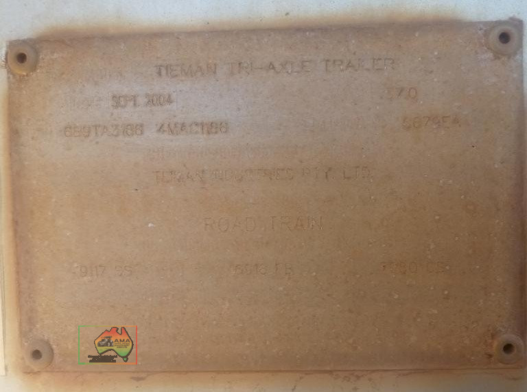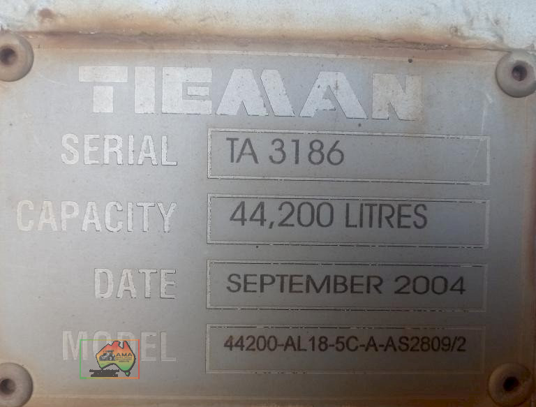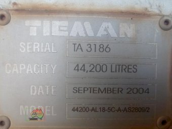 2004 Tieman Tri-Axle Tanker (44,200 Ltr) ~ Fitted with airbags ~ Alloy rims ~ Damaged on off side ~ Would suit on site static tank, or off-road for farming.
