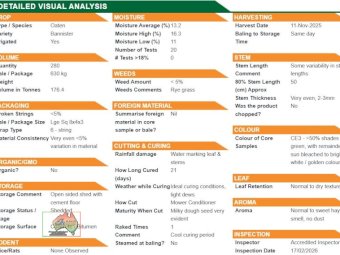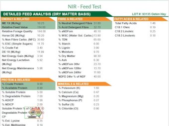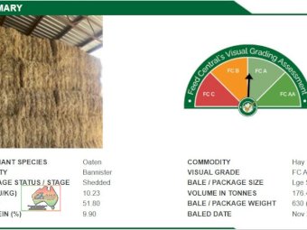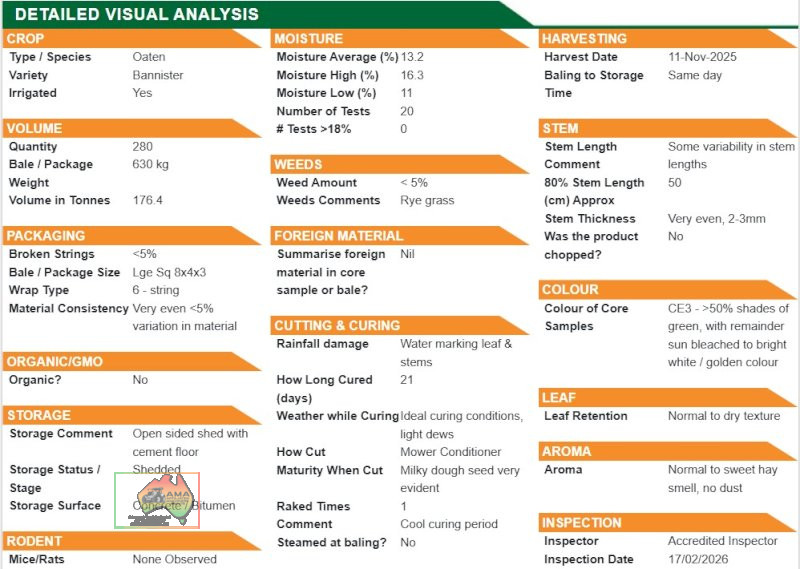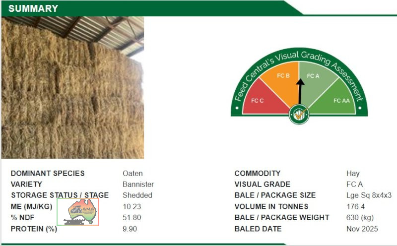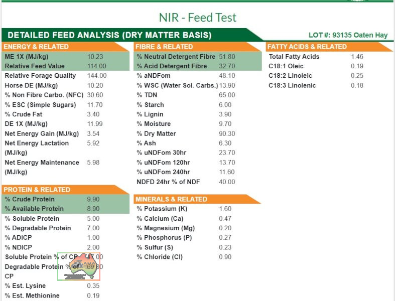 8x4x3 Bales of Oaten/Lucerne Hay ~ Approx 20% Lucerne ~ Ave weight 640Kg ~ Good colour, no rain damage ~ Shedded ~ Protein 9.90% ~ ME 10.23 (Feed Test attached)